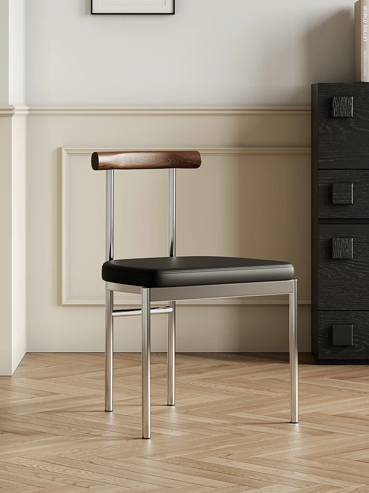 中古スタイルのステンレススチール製シンプルな無垢材の背もたれ付きダイニングチェア。家庭用フレンチデザイン、人気のある小型住居にぴったりの侘寂風チェア。洗練された美しさを引き立てる一品です。
