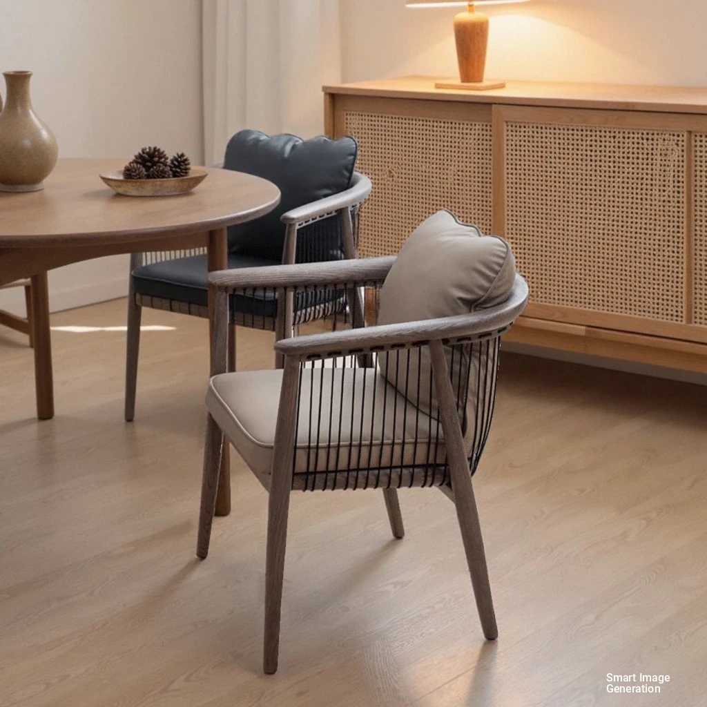 Vintage-inspired Solid Wood Dining Chair - Elegant Tea Chair with Retro Design, High-Quality Armrests, Perfect for Home Use, Featuring a Comfortable Backrest and Woven Ropes for a Touch of Wabi-Sabi Charm.