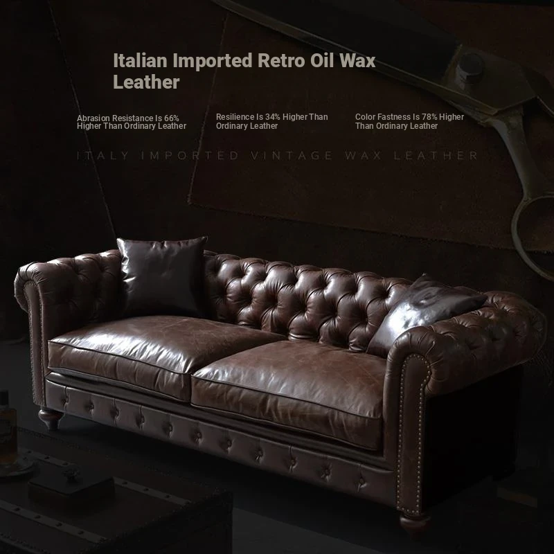 American Vintage Pull-Button Genuine Leather Brown Waxed Sofa for Wine Cellars, Lounges, and Small Living Rooms - Stylish and Durable Upholstery for Modern Homes