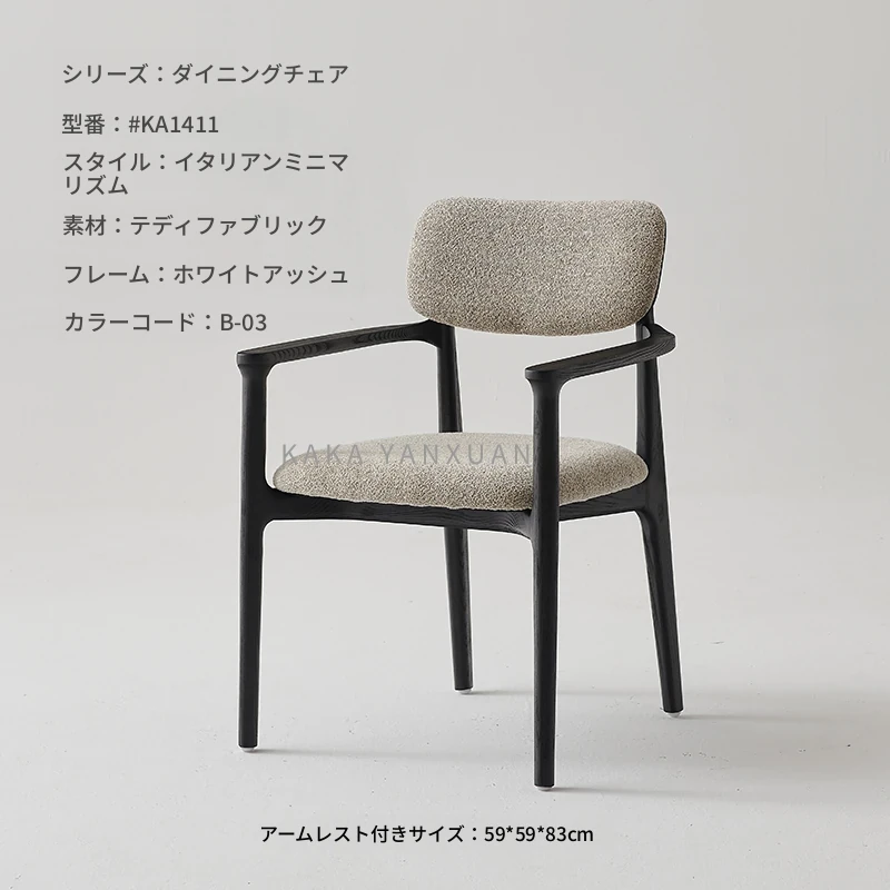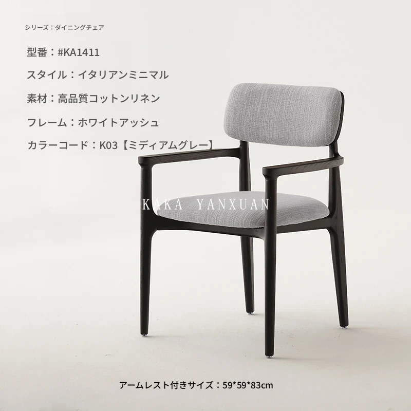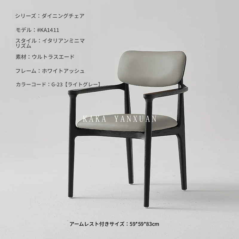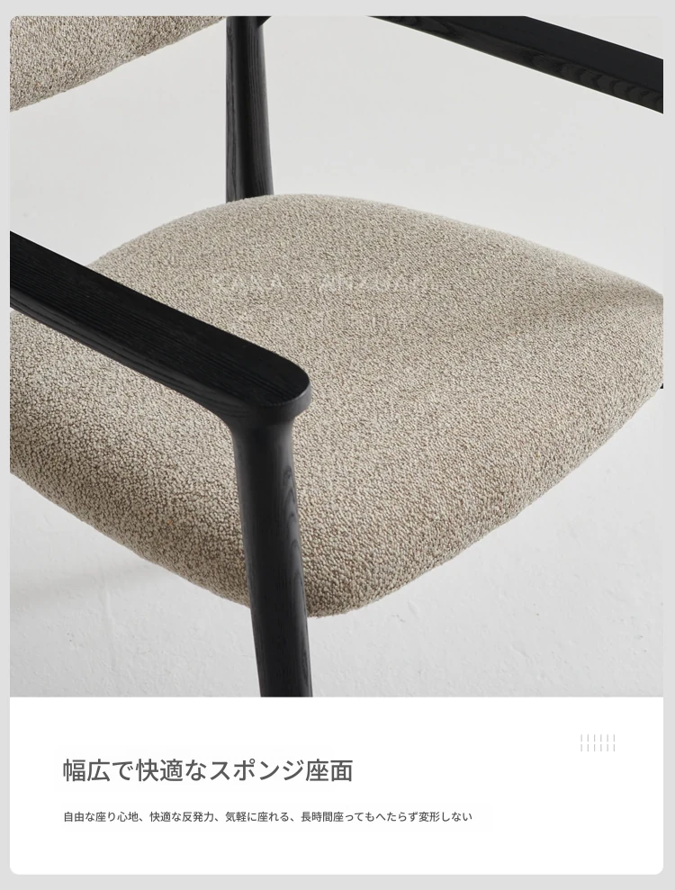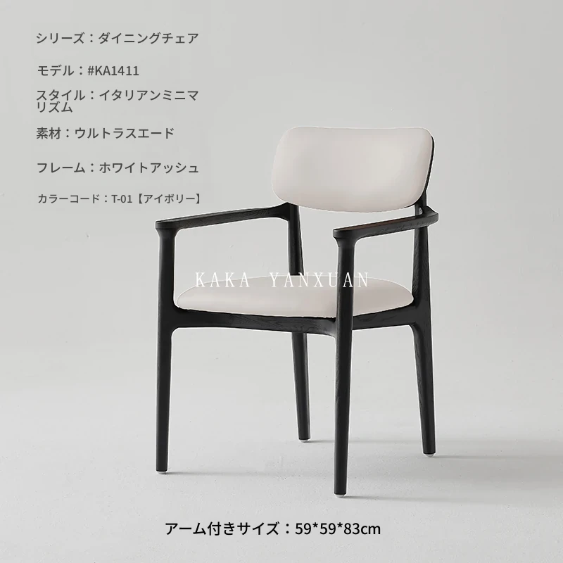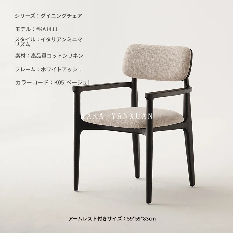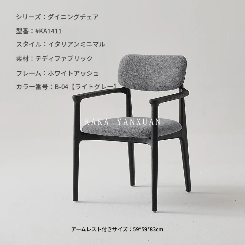 高級感あふれるイタリアンスタイルの布張りダイニングチェア。ホワイトアッシュのアームとシンプルなデザインが特徴の実木製デスクチェア。おしゃれな空間を演出し、居心地の良いひとときを提供します。