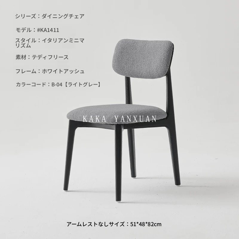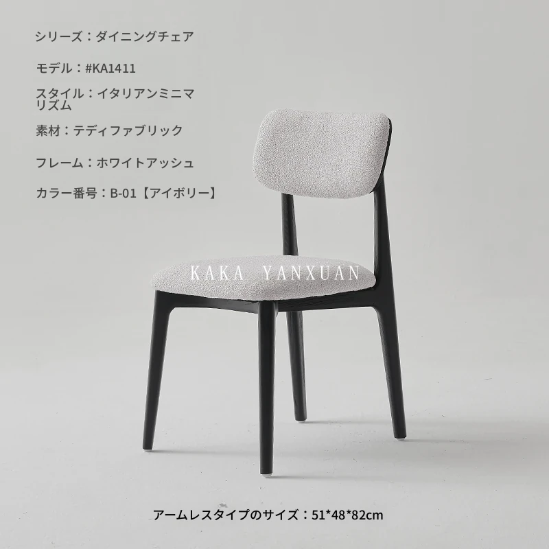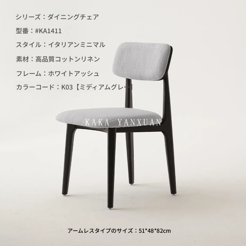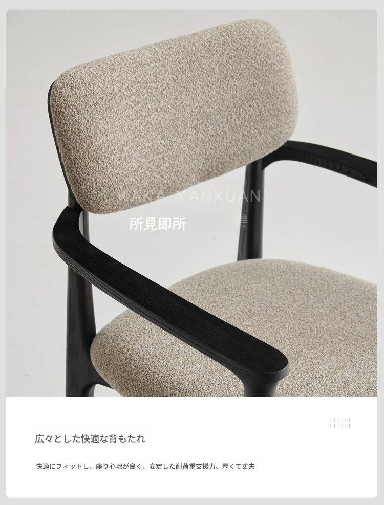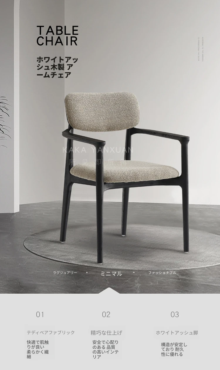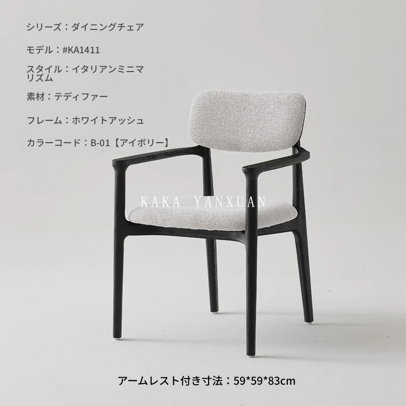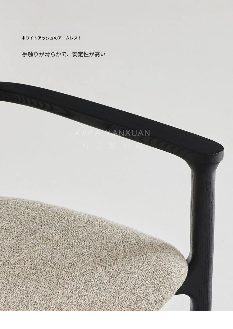 高級感あふれるイタリアンスタイルの布張りダイニングチェア。ホワイトアッシュのアームとシンプルなデザインが特徴の実木製デスクチェア。おしゃれな空間を演出し、居心地の良いひとときを提供します。