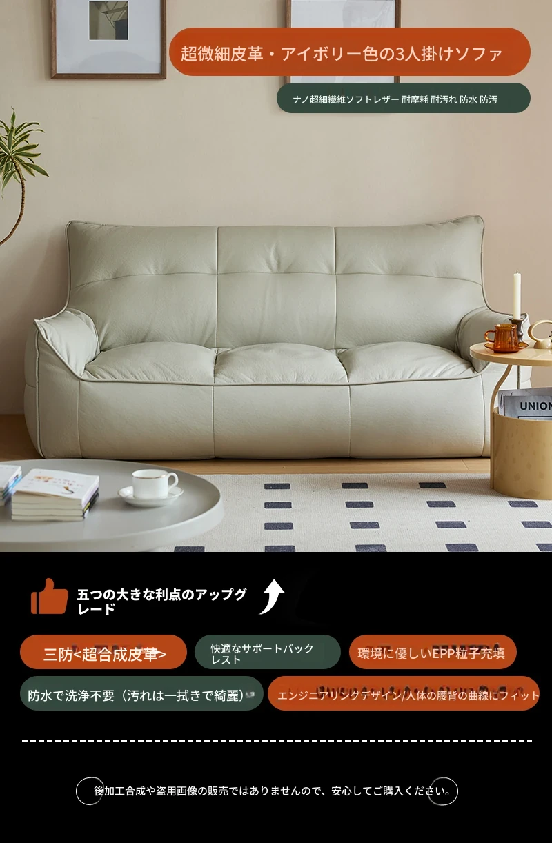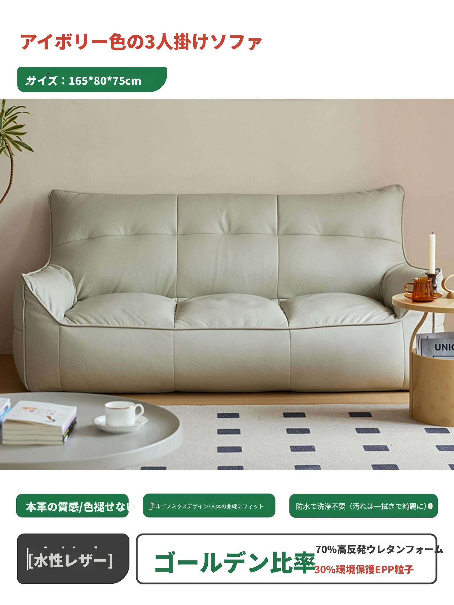 粒子タイプ【三防超合成皮革-アイボリー】3人用-座り心地が硬め