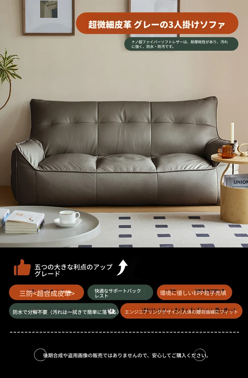 粒子タイプ【三防超合成皮革-グレー】3人用-座り心地が硬め