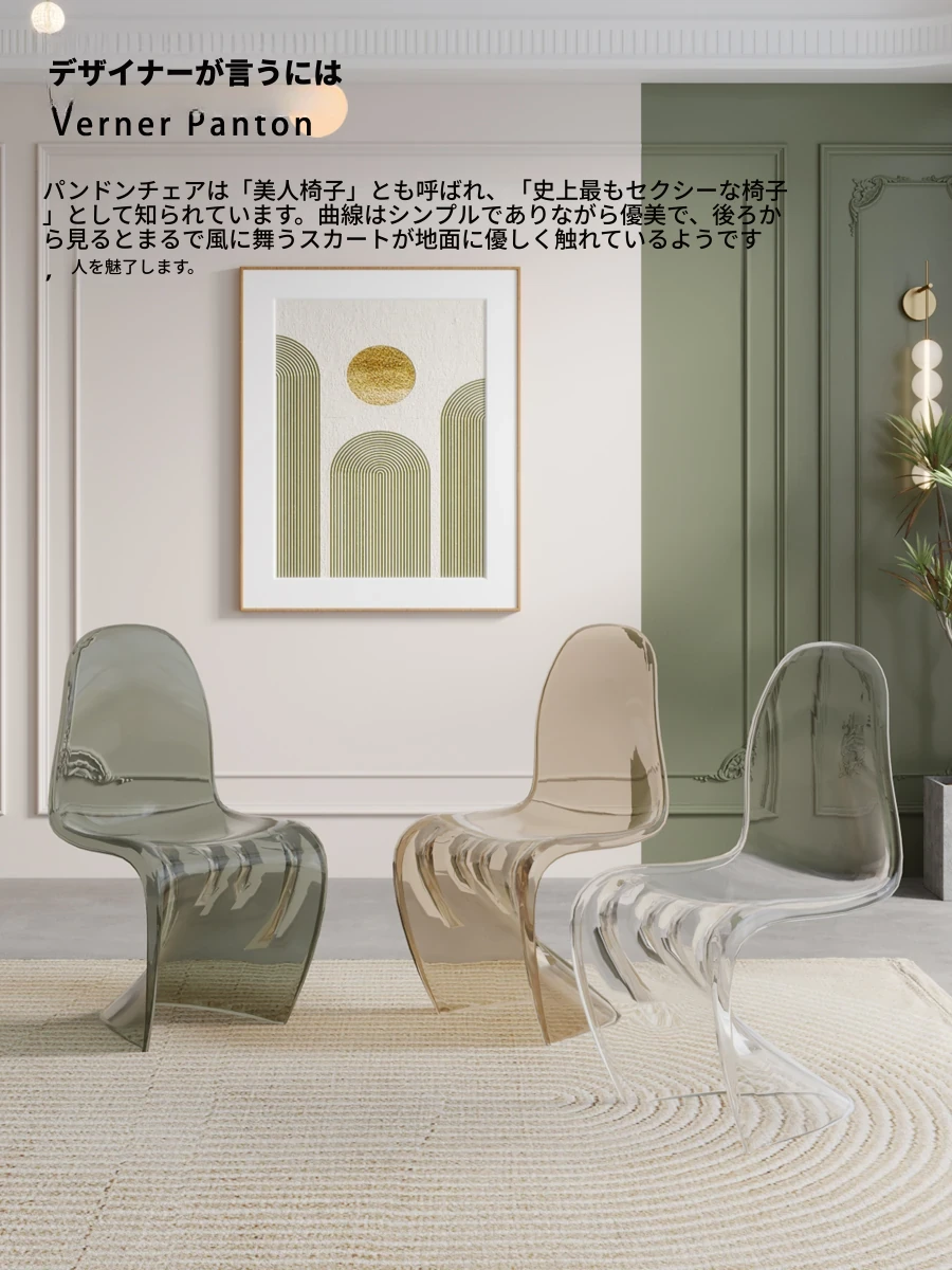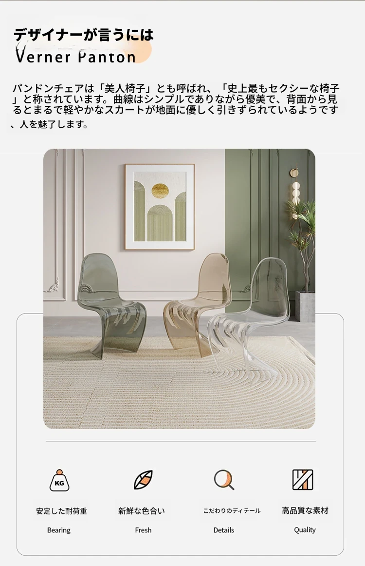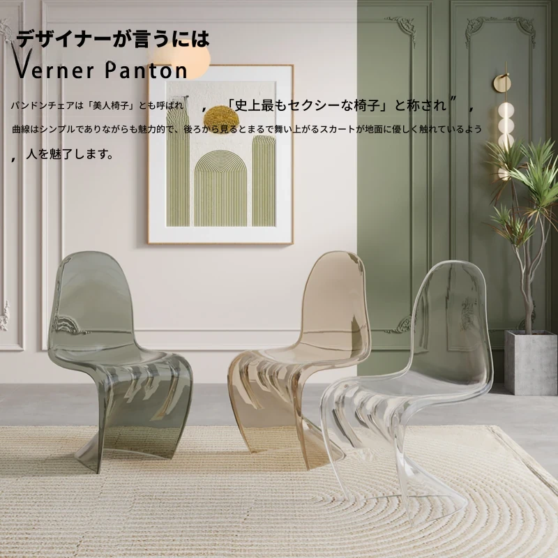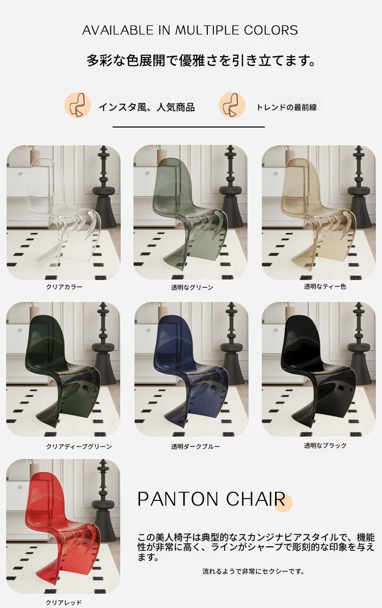 北欧風パントンチェア|透明プラスチック素材でスタイリッシュに!おしゃれで重ねられるダイニングチェア、シンプルモダンなデザインのリラックスできる背もたれ付き。メイク用スツールとしても最適!