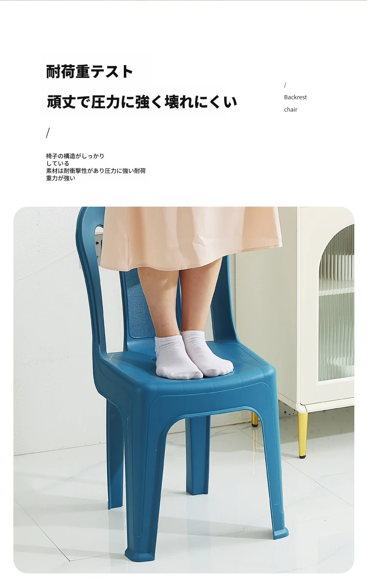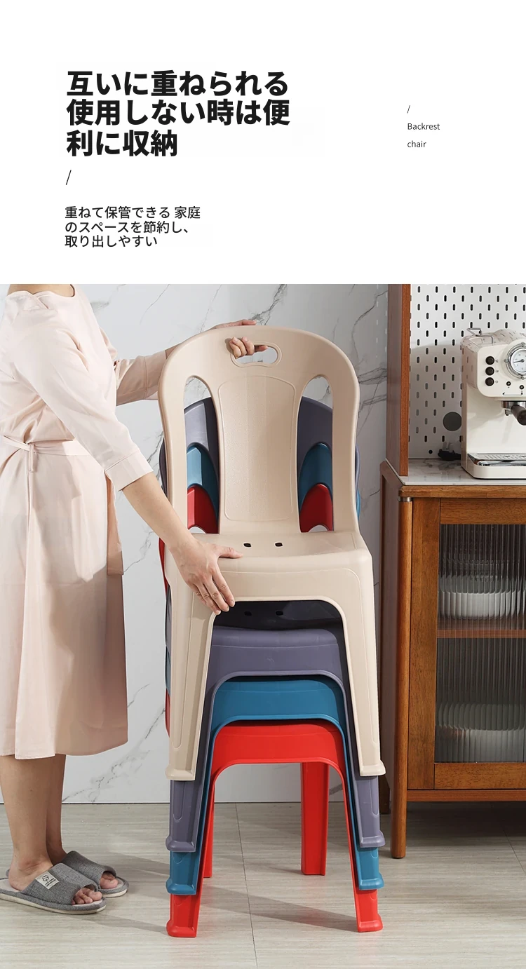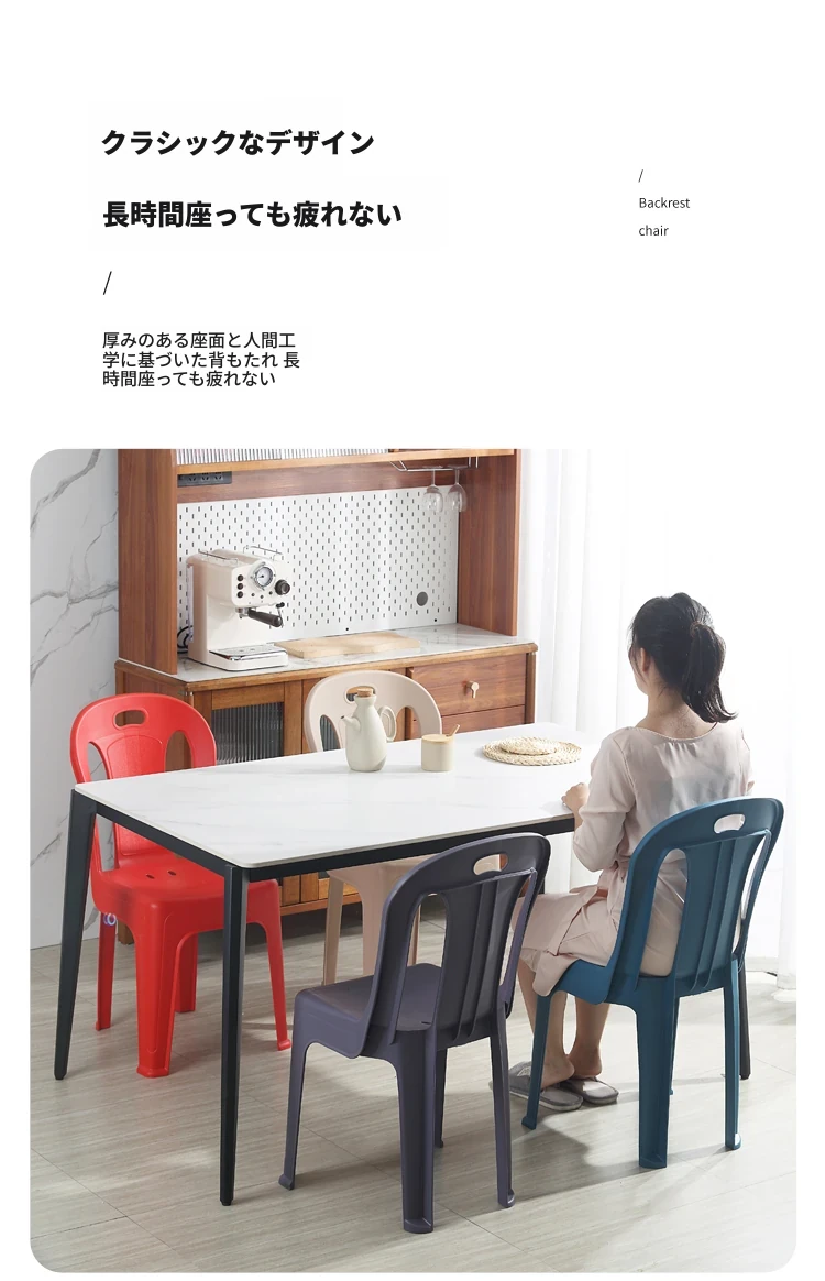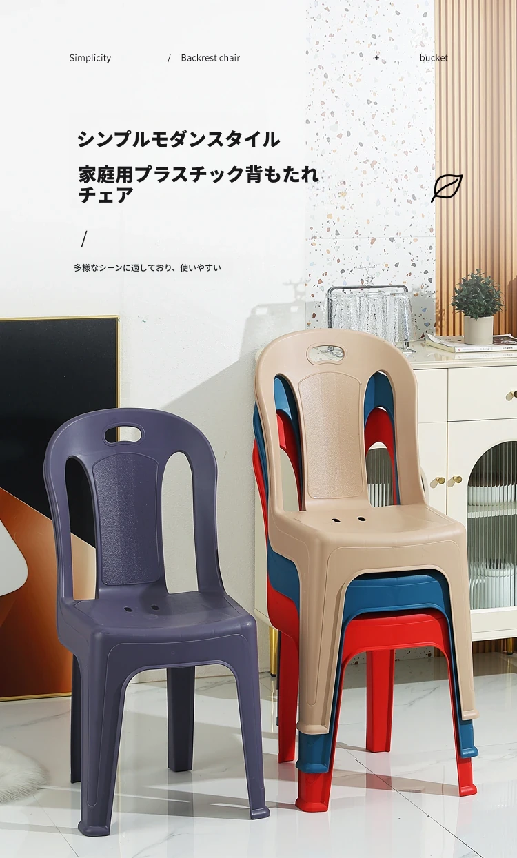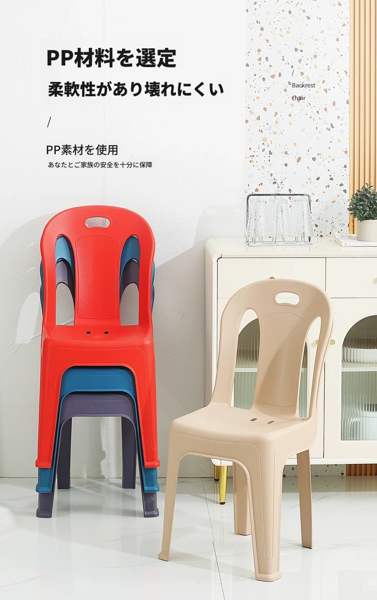 家庭用プラスチック製背もたれ椅子|リビングやカフェに最適!夜市や屋台にもぴったり。大人も子供も使えるデザインで、積み重ね可能な学習椅子としても活躍!